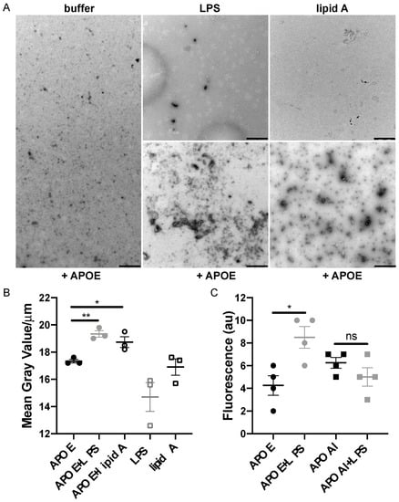 Figure 4. Detection of macromolecular complexes of APOE and bacterial products. (A) APOE (2 μM) was incubated with 100 μg/mL LPS or with lipid A from E. coli for 30 min at 37 °C. At the end of incubation, the macromolecular complexes were visualized by TEM. One representative image for each condition from three independent experiments is shown (n = 3). Scale bar represents 1 µm. (B) Analysis of the complexes of APOE and ligands following TEM. Quantification was performed using ImageJ 1.52k after all the images were converted to 8-bit, and the threshold was adjusted. The complexes of APOE and ligands are expressed as the mean of gray value/μm ± SEM. In the graph, each point represents at least ten pictures per each experiment (n = 3). Statistical analysis was performed using a one-way ANOVA with Dunnett’s multiple comparison tests, * = p ≤ 0.05 and ** = p ≤ 0.01. (C) ThT assay demonstrates aggregation of APOE in the presence of LPS from E. coli (n = 4). Statistical analysis was performed using a one-way ANOVA with Dunnett’s multiple comparison tests, * = p ≤ 0.05 and ns = not significant. Black dot = APOE, gray dot = APOE + LPS, empty circle = APOE + lipid A, empty gray square = LPS, empty black square = lipid A, black square = APOAI and gray square = APOAI + LPS.