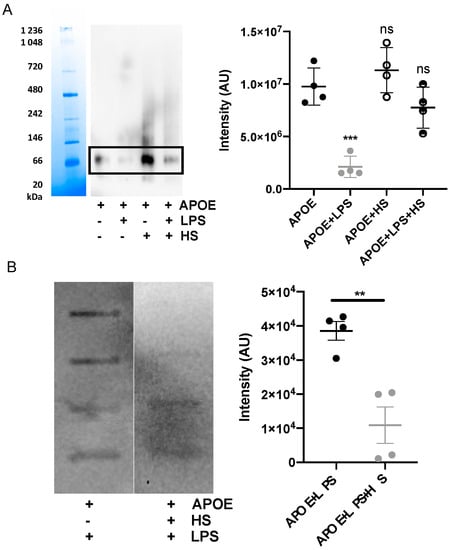 Additionally, we confirmed that the interaction between APOE and LPS can be blocked by including heparin in the mixture, which bonded to the similar receptor-binding region of APOE as LPS. The blockage of the interaction was verified by blue Native gel, which was followed by a Western blot assay. We performed an image analysis of the most pronounced protein band on the WB membrane, which corresponded to the dimeric form of APOE (above 66 kDa). We observed that dimeric APOE is released from the APOE-LPS complex in the presence of heparin (Figure 5A). Moreover, we used a slot-blot assay to confirm that heparin was able to block APOE and LPS interaction. We observed a significant decrease in LPS-band intensity on the membrane additionally treated with heparin (Figure 5B).