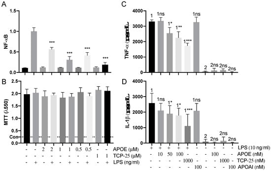 Figure 7. Anti-endotoxic effect of APOE in vitro. (A) THP-1-XBlue-CD14 cells were treated with APOE (0.5, 1 and 2 μM), LPS (10 ng/mL) from E. coli, or a combination of both. APOE yielded a significant reduction of activation of NF-κB/AP-1. *** p ≤ 0.001. (B) MTT viability assay for analysis of toxic effects of APOE on THP-1 cells. The dotted line (con) represents positive control of dead cells. The mean values of five measurements ± their SEM are shown (n = 5). p values were determined using one-way ANOVA with Dunnett’s multiple comparison test. Cytokine analysis of TNF-α (C) and IL-1ß (D) the blood collected from healthy donors at 24 h after treatment with 10 ng/mL LPS together with 10–50–100 nM APOE. Untreated blood was used as a baseline control. Blood treated with 10 ng/mL LPS together with 100 nM APOAI or 1000 nM TCP-25 were used for comparison. The mean ± SEM values of four independent experiments performed in duplicate are shown (n = 4). * = p ≤ 0.05, ** = p ≤ 0.01 and *** = p ≤ 0.001, ns = not significant, determined using two-way ANOVA with Sidak’s multiple comparisons test.