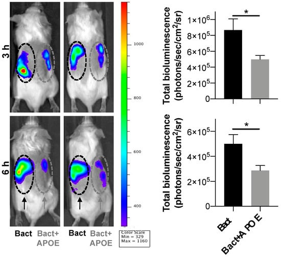 We next investigated whether APOE could suppress local inflammation triggered by bacteria in vivo. For this experiment, we utilized the (NF-κB-RE-Luc)-Xen reporter mouse model and studied the effects of APOE on subcutaneous inflammation induced by heat-killed bacteria P. aeruginosa (PAO1). We used killed bacteria to exclude the possible confounding effects of bacterial growth in vivo after subcutaneous deposition of live bacteria. Heat-killed bacteria (1 × 106 cfu/mouse) were subcutaneously injected into the left or right side of mouse dorsum, either with or without 200 µL of APOE (2 µM). After injection of luciferin substrate, the luminescent signal, which corresponded to NF-κB activation, was detected by an in vivo bioimaging system (IVIS Spectrum) (Figure 8). IVIS image analysis showed a significant reduction in NF-κB activation after 3 and 6 h at the site challenged by both APOE and heat-killed bacteria, which was compared to heat killed bacteria-treatment alone. APOE alone did not yield any significant increase in NF-κB activation (Figure S6).