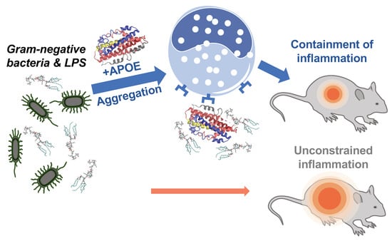 Antimicrobial resistance is a serious threat to global public health that requires the acute need for the development of new therapeutic strategies [39,40,41]. The endogenous mechanism, by which pro-aggregation proteins such as APOE promote the containment of LPS-induced inflammation, is illustrated in Figure 9. We have previously described a similar mechanism of endogenous protein aggregation of thrombin C-terminal peptides trigged by bacterial endotoxins [12,15].