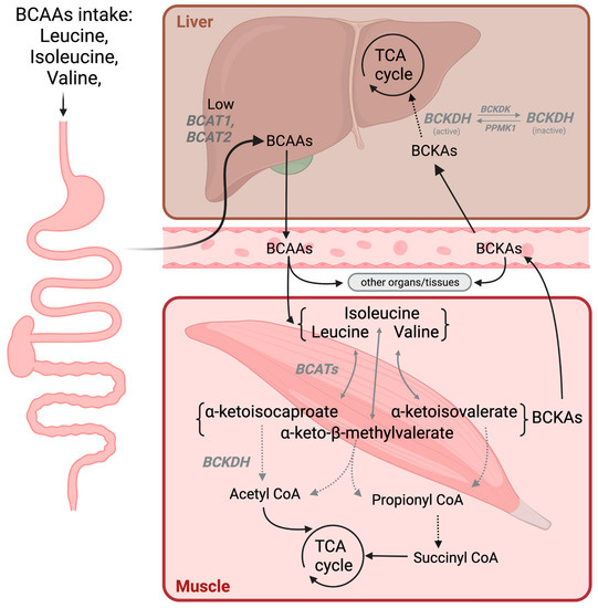 It is known that, upon oral intake of BCAAs, they circulate in the bloodstream, by-passing the first-pass metabolism in the liver due to the low activity of branched-chain amino transferases [21]. Branched-chain amino transferases BCAT1 and BCAT2 are the first enzymes to degrade BCAAs. They catalyze the reversible conversion of BCAAs to branched-chain α-ketoacids (BCKAs)—leucine to α-ketoisocaproate, valine to α-ketoisovalerate, and isoleucine to α-keto-β-methylvalerate—by transferring the amino groups to α-ketoglutarate (Figure 1). BCATs are found in many tissues, but are mostly expressed in the skeletal muscle; thus, they form the main metabolism site of BCAAs, with over half of the total circulating BCAAs ending up there, while a quarter enter the splanchnic circulation, and the remainder are used up by the brain and other tissues [22]. Once converted into BCKAs, they can undergo a series of irreversible enzymatic reactions, or move into the circulation for decomposition in other tissues.