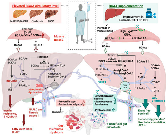 Schematic diagram depicting the conflicting role of BCAAs in liver diseases. The left (red) side represents a summary of known molecular pathways in the liver and gut microbiota dysbiosis upon elevated circulatory BCAAs that may contribute to the progression of liver diseases. The right (green) side summarizes the potential mechanisms that may explain how BCAA supplementation improves liver diseases’ outcomes. (1) Ingested BCAA undergoes transamination with α-ketoglutarate by BCATs, which generates glutamate, which is used in ammonia detoxification to glutamine. (2) Elevated BCAAs upregulate PPARα, which suppressed the rate-limiting enzyme of BCAAs’ catabolism, BCKDK. (3) Enhanced BC-acyl-CoA due to the lower suppression of BCKDH. (4) Supplementation increases beneficial gut microbiota while suppressing the phylum proteobacteria that includes pathogenic genera. BCAAs, branched-chain amino acids; AA, amino acid; BCATs, branched-chain amino transferases; BCKAs, branched-chain α-ketoacids; BCKDH, branched-chain alpha-keto acid dehydrogenase; BCKDK, BCKDH kinase; IRS-1, insulin receptor substrate 1; NAFLD, non-alcoholic fatty liver diseases; GLU, glutamate; GLN, glutamine; HCC, hepatocellular carcinoma; PI3K/AkT, phosphatidylinositol 3-kinase/protein kinase B; PPAR-α, peroxisome proliferator-activated receptor alpha; mTORC1, mTOR complex 1; BC-acyl CoAs, branched-chain acyl-CoAs; TGF-β1, transforming growth factor beta 1; VEGF, vascular endothelial growth factor. Figure created with BioRender.com, accessed on 13 April 2022 San Francisco, CA, USA).