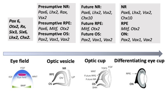 A schematic illustration of the groups of key transcription factors whose expression is associated with the main successive stages of eye development. NR—neural retina, RPE—retinal pigmented epithelium, OS—optic stalk, ON—optic nerve. See the detailed description is in the text.