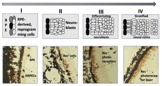 Regeneration of the retina in caudate amphibians. Above: (I)—the exit of RPE cells from the layer, the loss of initial traits and properties (dedifferentiation); (II)—the formation of an intermediate population of amplifying neuroblasts; (III)—NR anlage cells exit the cycle of reproduction having accumulated a certain number of their population; (IV)—NR anlage cells acquire the retinal neuron and glial phenotypes and build stratified matured retina. Lower row: calcium-binding protein recoverin expression in regenerating retina cells in newt that reflects the stages of ONL formation [137]. DRPECs—dedifferentiating RPE-derived cells.