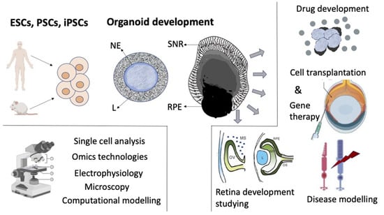 Three-dimensional retinal organoids obtained from pluripotent stem cells mimicking in vivo development. ESCs—embryonic stem cells; PSCs—pluripotent stem cells; iPSCs—induced pluripotent stem cells; NE—neuroepithelium; L—laminin; RPE—retinal pigment epithelium. SNR—stratified neural retina. Left box at the bottom: the methods of retinal organoids’ research. Right box: the directions of retinal organoids’ application.