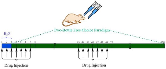 Two-bottle free-choice experiments [,,,] were used to test the effects of a fixed dose of UFR2709 (2.5 mg/kg) on the voluntary ethanol intake of UChB rats. UChB rats were individually exposed to continuous access (24 h/day) of ethanol 10% v/v or distilled water in a two-bottle free-choice protocol. To prevent a potential position preference, bottles were daily alternated. All rats used were naïve but came from UChB bibulous mothers. The rats were then randomly divided into two groups (n = 7 per group), and a daily i.p. injection of UFR2709-HCl (2.5 mg/kg) or saline (1 mL/kg) was administered for 7 days at 15:00 h in a two-cycle paradigm, at days 1 to 7 and days 63 to 69 of the experiment (Figure 1). On days 1–2, animals were injected with UFR2709 or vehicle but were not given alcohol access, with the purpose to achieve pharmacologically effective drug concentration in the rats, before starting ethanol exposure. On day 3, ethanol access was started under 24 h continuous access two-bottle free-choice paradigm and maintained until day 100.