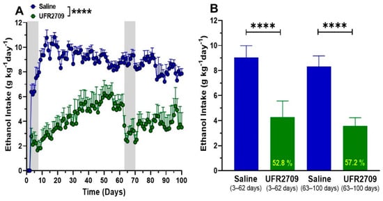 (A) A two-bottle free-choice experiment was used to test the effects of a fixed dose of UFR2709 (2.5 mg/kg) on the voluntary ethanol intake of UChB rats per 100 days. Each point represents the average ethanol intake for 7 animals per group during the experiment period. Rats (n = 7 per group) were administered a single i.p. injection of UFR2709 (2.5 mg/kg/day) or saline (1 mL/kg/day) at 15:00 h, and ethanol consumption was recorded at 14:00 h the next day. Drug administration was made in two stages, the first treatment was the days 1st to 7th and the second treatment was the days 63rd to 69th (labeled in gray in the graph). (B) Total average ethanol intake of the two stages of the experiments, days 3–62 in the first period and days 63–100 in the second one. An unpaired t-test was used to compare UFR2709 and saline group averages. Data are expressed as mean ± SEM (g/kg/day), and the number inside the bar indicates the percentage of reduction in ethanol intake compared to the saline-treated group. **** p < 0.0001.