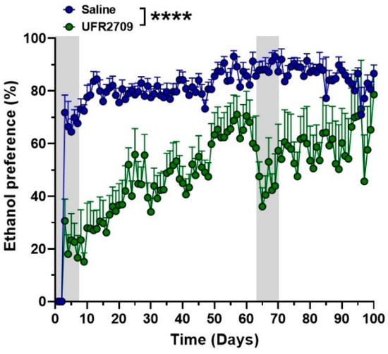 Additionally, UFR2709 treatment significantly decreased the preference of the animals for the ethanol solution in the first stage of the experiment (days 3 to 62) compared to the saline-treated animals. In the second period of the experiment (days 63–100), the preference of the animals remained lower (approximately 60%) in comparison to the saline group, which showed ethanol preference close to 80% (Figure 3) (interaction [F (99,1200) = 1.442, p = 0.004]; days [F (99,1200) = 5.969, p < 0.0001]; treatment [F (1,1200) = 928.7, p < 0.0001]).