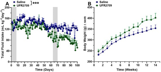 A two-way ANOVA with Bonferroni´s multiple comparison test between drug, saline and days showed that 2.5 mg/kg of UFR2709 produced significant differences on total fluid intake (Figure 4A) compared to the saline group (interaction [F (99,1200) = 1.748, p < 0.0001]; days [F (99,1200) = 6.938, p < 0.0001]; treatment [F (1,1200) = 350.7, p < 0.0001]). In the first stage of the experiment, the UFR2709 treatment did affect the total fluid intake (days 3 to 62) compared to the saline-treated animals. However, in the second period of the experiment (days 63–100), the total fluid intake of the animals treated with UFR2702 showed a lower total fluid intake in comparison to the saline group (Figure 4A). The administration of UFR2709 and the time course of the experiment did not affect the body weight compared to the saline group, and a normal increase in body weight was observed during the course of this study (interaction [F (13,168) = 0.4239, p = 0.9596]; days [F (13,168) = 21.12, p < 0.0001]; treatment [F (13,168) = 32.55, p < 0.0001]) (Figure 4B).