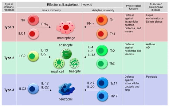 Advances in the pathogenic characterization of immune-mediated inflammatory diseases have resulted in the development of molecular-based classifications [,,]. The most well-known classification is that immune responses may be categorized into three major types (type 1, type 2, and type 3 responses) on the basis of the specific subsets of innate lymphoid cells (ILCs), innate effector cells, and CD4 effector T cells involved []. In each type of immune response, the innate and adaptive immune systems act together to eliminate a specific type of pathogen. Type 1 immunity provides protection against intracellular microbes, such as bacteria, protozoa, and some viruses. Type 2 immunity is mainly devoted to protection against helminths and venoms, and type 3 immunity targets extracellular bacteria and fungi (Figure 1). However, inappropriate activation of a specific type of immune response can cause different types of immune-mediated disorders (Figure 1). For example, interferon (IFN)-associated type 1 immune responses may be directed against self-antigens, leading to autoimmune diseases, including lupus erythematosus and lichen planus [,]. On the other hand, exaggerated type 2 immunity is associated with allergic diseases, such as asthma and AD, and dominant type 3 immunity is detected in psoriasis (Figure 1). Interestingly, the key cytokines of one immune pathway are capable of blocking another pathway. For instance, AD and psoriasis represent two distinct pathogenetic entities at polar ends of the T-cell inflammatory milieu; AD is considered to be a polar T helper 2 (Th2) cell disease, while psoriasis is considered to be driven by Th1/Th17 cells, and they usually mutually antagonize each other []. Grouping immune-mediated inflammatory diseases according to their molecular pathogenesis also provides a rationale for the use of targeted therapies [,,]. In this section, the pathogeneses of the idiopathic counterparts of PRs caused by biologic agents (psoriasis, AD, and lupus) are described, with specific focus on the signature cytokines involved in each disease.