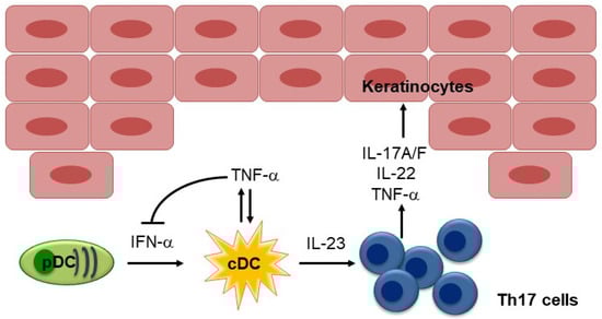 It has been hypothesized that the IFN-α and TNF-α produced by pDCs in psoriatic skin drives IL-23 production by myeloid DCs and the subsequent activation of Th17 cells. TNF-α also acts synergistically with IL-17 to upregulate the expression of inflammatory genes implicated in psoriasis, including genes that encode key molecules in the molecular signature of psoriasis, such as psoriasin (S100A7), β-defensin, IL-8, chemokine (C-C motif) ligand 20 (CCL20), IL-23 (p19), and chemokine (C-X-C motif) ligand 1 (CXCL1) []. The efficacy of TNF-α inhibitors against psoriasis underscores the importance of this cytokine in the disease, although the percentage of patients that experience marked improvements in their conditions is significantly lower than is the case after treatment with IL-17 or IL-23 inhibitors [].