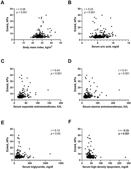 Correlation between Emed and clinical data in T2D patients with NAFLD. (A) body mass index. (B) serum uric acid level. (C) serum aspartate aminotransferase activity. (D) serum alanine aminotransferase activity. (E) serum triglyceride level. (F) serum high density lipoprotein level.