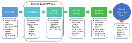 The proposed approach was carried out in five main steps. First, the raw EEG data from one patient were preprocessed by applying a 50 Hz notch filter to remove line noise and by applying a band-pass filter to the noise-free EEG data. Then, feature extraction from band-passed EEGs was performed, and 1080 features were extracted from each band-passed signal. These two steps were performed using a custom-made software conceptualized, designed, and developed by us, Training Builder (TrB) software [20], a multipurpose and extendable software tool that allows one to analyze EEG signals using the sliding window paradigm [21]. Afterwards, feature selection was performed using the Information Gain and Pearson Correlation filters. Then, a machine learning approach using a -nearest neighbor (-) algorithm was applied on preictal, ictal, and interictal EEG recordings. Finally, the selected -s were tested on the EEG recordings of five other randomly selected patients from the same dataset to test the portability of the model to other patients. The complete analysis pipeline is shown in Figure 1.