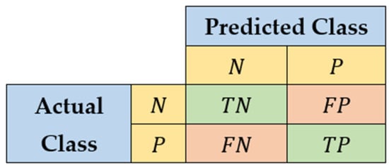 All the performance measures of a model, such as a classifier, are based on the confusion matrix () [33]. A very common form of , which we used in our work, is shown in Figure 2. The elements tagged with “” are the negative elements of the target class in the dataset, and they represent, in our case study, the majority class. The elements tagged with “” are the positive elements of the target class in the dataset, and they form the minority class.