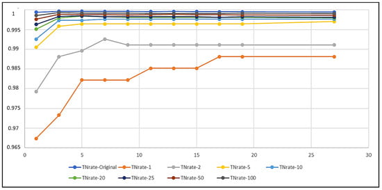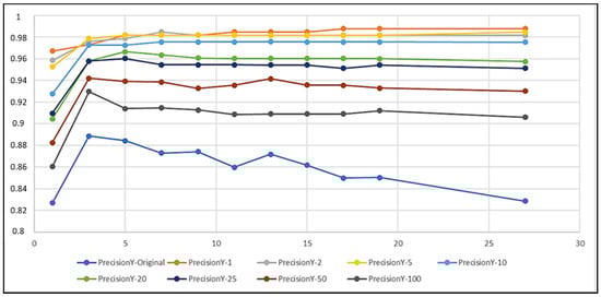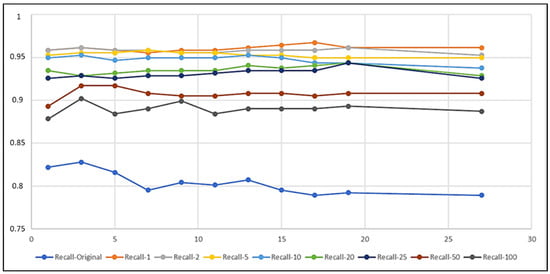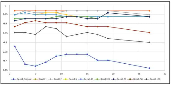 In the figures in the current section, but also in the figures in Section 4.2, each curve refers to a different training set obtained by setting a different imbalance ratio () in the technique (Section 3.3). Figure 3, Figure 4, and Figure 5 describe, respectively, the trends of Recall on , Precision on , and Recall on as the number of the nearest neighbors varied.