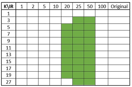 The outcomes of data classification depend on the selection of parameters of the - algorithm and, in our case, on the parameter and on the value, which are related to how the training data were prepared. In this section, we use the symbol to indicate that the - algorithm was applied starting from the dataset with the (imbalance ratio) and considering the -nearest neighbors (the parameter varied in ). The - results are reported considering the -fold cross-validation () and the tests on the ictal and interictal phases.