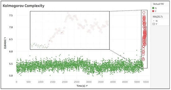 In order to understand the results achieved by the model in the detection of seizures, an error analysis was also performed. Figure 10 shows the trend over time of the Kolmogorov Complexity (KC; in E1, B40) of the IKTAL file (we chose the KC for graphic reasons only). The preictal phase is shown in green, the ictal phase in red. Every point refers to a second of registration ( and ). Points classified by as negative elements are indicated with a small circle, while those classified as positive are indicated with a larger circle. Moreover, Figure 10 also shows a detail of IKTAL registration in the box, in which six positive points classified as negative ( elements) by the model can be seen. Four out of these six classification errors were at the beginning of the ictal period, and this can be interpreted as a 4 s delay of the method in detecting the seizure. This mistake could be due to a somewhat fuzzy start of the seizure. However, more likely, it may also be due to the tagging of the incipit of the crisis, which is very subjective and highly depends on the epileptologist that manually marks the seizures in the EEG traces.