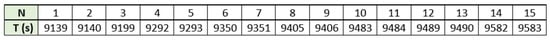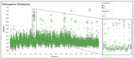 In the lateral box of Figure 11, the detail of the agglomeration of 15 of the 39 points erroneously classified as positive is shown, and the list of the time points where they were detected is shown in Figure 12. These 15 points, but also the remaining points in the graph, were not consecutive, and, at most, there were two consecutive points. These errors were almost always located at the spikes of the Kolmogorov Complexity curve.