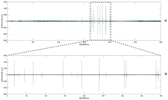 Qualitative analysis of false positives described in Figure 12: one-hour EEG signal from E1, band B40 (a), and a focused view on the time interval where the false positives were detected by the method (b).