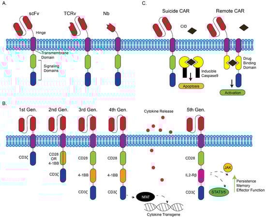 The extracellular target-binding region is composed of a single chain fragment variable (scFv) from antibody light and heavy chain variable regions. While scFvs are the most common extracellular domain, some CAR designs include a high-affinity TCR to detect intracellular TAAs or include a nanobody domain derived from camelid antibodies (Figure 1A) [20,21]. This extracellular target-binding domain is joined by the transmembrane domain to various signaling domains consisting of a primary signaling domain (CD3ζ) and co-stimulatory domains (CD28 or 4-1BB or OX-40) [22,23,24]. First generation CAR T cells only included CD3ζ as their internal signaling domain; however, they were not effective because the cells lacked co-stimulation to become fully activated. Further generations of CARs helped to resolve activation and persistence difficulties by adjusting signaling and cellular patterns to better match the natural immune activation signal (Figure 1B). Second generation CARs have an additional costimulatory domain (e.g., CD28 or 4-1BB or OX-40), which provides proper co-stimulation that is necessary for full T cell activation. Third generation CARs sought to improve upon the second generation by adding an additional co-stimulatory domain as part of the primary signal, such as a combination of both CD28 and 4-1BB, or OX40 in conjunction with CD3ζ [25]. Fourth generation CAR T cells, also known as T cells redirected for antigen-unrestricted cytokine-initiated killing (TRUCKs), include a transgenic cytokine, such as IL-12, which encodes a secreted cytokine that is induced through NFAT signaling. Cytokines secreted by TRUCKs (IL-12, IL-7, IL-15, IL-18 etc.) help to support tumor destruction and are localized in the tissue targeted by the CAR T cell [26]. While previous generations of CARs sought to increase effector function of T cells, fifth generation CARs seek to address the potential adverse effects that can be present in CAR T cell treatment, including neurotoxicity and cytokine release syndrome (CRS). CRS is a sudden and widespread release of inflammatory cytokines by T cells composed predominantly of IL-6, INF-γ, and IL-10. The purpose of fifth generation CAR T cells is to localize cytokine signaling only in the presence of the cancer antigen. Fifth generation CAR T cells are the newest proposed mode of action that include an intracellular signaling domain for cytokine signaling receptors, such as IL2-Rβ, which will trigger the JAK/STAT pathway to stimulate effector function, persistence, and memory, and provide stimulation that would come through normal cytokine signaling. Cytokine production and stimulation induced through the JAK/STAT pathway was shown to promote a similar response in the cell as if it had received IL-21 stimulation. The net effect is local effector cytokine production and stimulation, only when in direct contact with the tumor antigen, to mitigate overabundant cytokine production that leads to CRS [27,28]. Alternative CAR T cell formats include remote CAR T cells that have inducible activation responses, and suicide CARs that include a suicide signal once treatment is concluded or no longer needed (Figure 1C) [29,30].