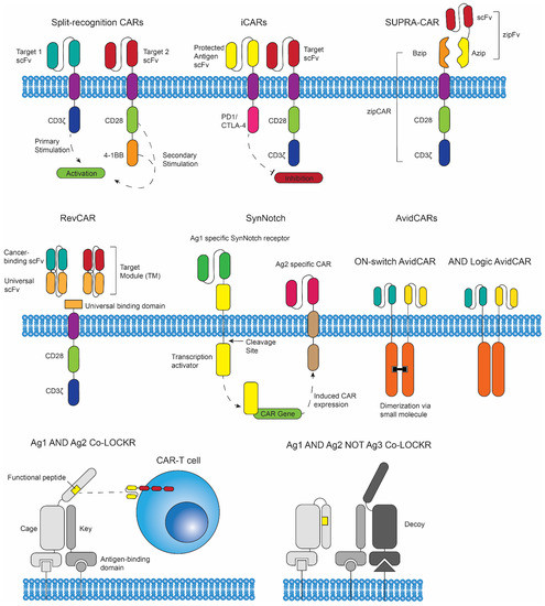 Another CAR modification using AND logic gating is a split universal programable (SUPRA) CAR. In this design, a zipCAR is introduced into a T cell, containing a basic leucine zipper (Bzip) binding domain combined with transmembrane and intracellular signaling domains [72]. A zipFv is also engineered, which includes an Azip domain (which binds to the Bzip region) bound to an scFv (Figure 2). This lock and key method of attaching to the binding domain has several advantages, including the ability to switch the antigen binding domain, fine-tune activation through adjustment in Azip/Bzip binding affinity, and combine multiple scFvs in one therapeutic approach. SUPRA CARs were further developed to have a separate inhibitory domain, adding NOT logic to their capabilities [73]. In mouse models for leukemia and breast cancer, SUPRA-CARs had an anti-tumor effect comparable with conventional CAR T cells; their versatility may make them a more promising option [72,73].