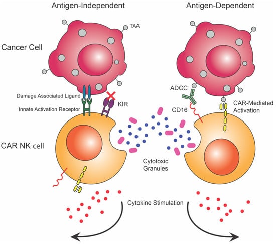 Another cell type being studied for cancer immunotherapy are NK cells. NK cells are innate cytotoxic lymphocytes that can recognize viral infection, cancers, and stressed cells. NK cells can initiate an antibody mediated cytotoxic response through their antibody Fc receptor FcγRIII (CD16) [81]. NK cells can innately recognize cancerous cells in an antigen-independent manner through HLA downregulation on the cancer, as well as through the recognition of damage patterns that may be on the surface of cancerous cells. CAR NK cells additionally target cancer in an antigen-dependent manner through the receptor stimulation allowing for bimodal action of CAR NK cells [82,83,84,85,86,87] (Figure 4).
