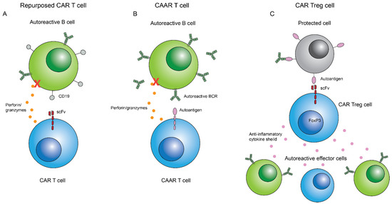 The success of CAR T cells in treating cancer has led researchers to question if this concept can be applied to other diseases. Autoimmune diseases are a natural CAR application because they are often mediated by lymphocytes, and thus are more easily targeted by CAR T cells and avoid difficulties related to the TME compared to cancerous cells found within solid tumors [165]. There are three main approaches to treating autoimmune disease with CAR T cells, which are as follows: (1) repurposed standard CAR T cell constructs for specific autoimmune epitopes, (2) Chimeric autoantigen receptor (CAAR) T cells, which use an autoantigen as bait for autoreactive B cells, and (3) CAR regulatory T cells (Treg) cells, which can counteract the chronic inflammatory response of autoimmune diseases (Figure 6).