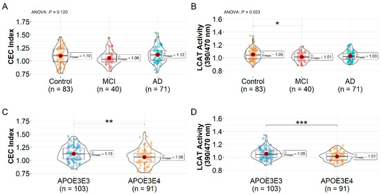 The mean ± SD CEC index and LCAT activity are shown in Table 2. When participants were not stratified by the APOE genotype, there was no significant difference in the HDL CEC index between the control, MCI, and AD participants by one-way ANOVA (1.10 ± 0.16, 1.06 ± 0.14, and 1.12 ± 0.14, F(2, 191) = 2.14, p = 0.120, Figure 1A). A one-way ANOVA revealed that there was a significant difference in HDL LCAT activity between at least two groups (F(2, 191) = 3.87, p = 0.023). Post hoc comparisons indicated the HDL LCAT activity was significantly higher in the control group vs. MCI (1.05 ± 0.09 vs. 1.01 ± 0.07, p = 0.030) but not significantly higher than the AD group (1.03 ± 0.07, p = 0.118, Figure 1B). There were no significant differences in LCAT activity between MCI and AD (p = 0.661). The CEC index (1.06 ± 0.16 vs. 1.13 ± 0.14, t(192) = 3.00, p = 0.003) and LCAT activity (1.01 ± 0.07 vs. 1.05 ± 0.08, t(192) = 3.53, p < 0.001) were significantly lower in the APOE3E4 carriers relative to the APOE3E3 carriers (Figure 1C,D).