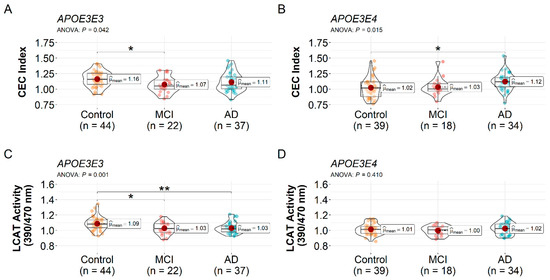 APOE-specific alteration in the HDL CEC index and LCAT activity amongst the control, MCI, and AD participants. The HDL CEC index within the (A) APOE3E3 and (B) APOE3E4 carriers by diagnosis. Decrease of LCAT activity in (C) APOE3E3 patients but not (D) APOE3E4 patients. One-way ANOVA followed by Tukey’s multiple comparison tests was used. * p < 0.05 and ** p < 0.01. Abbreviations: AD = Alzheimer’s disease dementia, CEC = cholesterol efflux capacity, HDL = high-density lipoproteins, LCAT = lecithin-cholesterol acyltransferase, MCI = mild cognitive impairment.