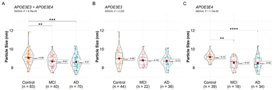High-density lipoproteins particle size is reduced in MCI and AD patients. Mean particle diameter (nm) between (A) the controls, mild cognitive impairment (MCI), and Alzheimer’s disease dementia (AD) patients and controls, MCI, and AD patients stratified by the (B) APOE3E3 and (C) APOE3E4 genotypes. One-way ANOVA followed by Tukey’s multiple comparison tests was used. ** p < 0.01, *** p < 0.001, and **** p < 0.0001.