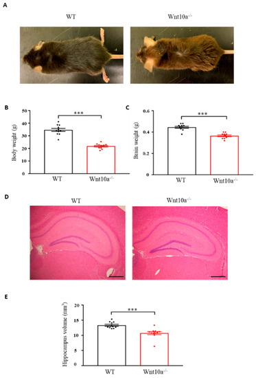 Mouse appearance, body weight, brain weight, and hippocampal volume. Compared with WT mice, Wnt10a-/- mice were smaller in size (A). Body weights (B), brain weights (C), and hippocampal volumes (D,E) were significantly lower in Wnt10a-/- mice. Data are expressed as mean ± SEM; n = 11/group; *** p < 0.001; scale bars = 500 μm.