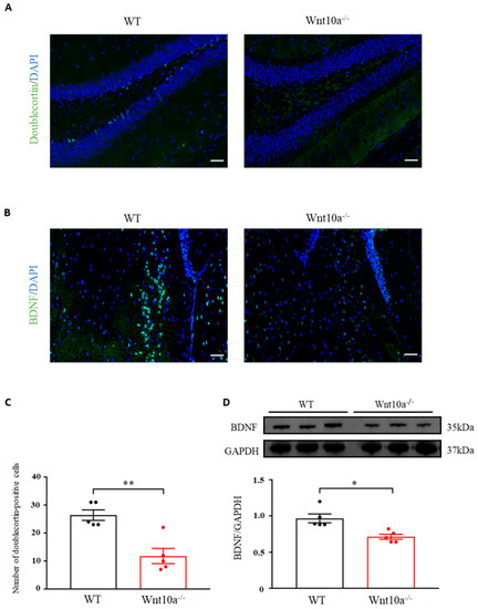 Neurogenesis in the hippocampal DG was evaluated by analyzing the expression level of doublecortin, an indicator for adult neurogenesis. The average number of doublecortin-positive cells of the hippocampal DG was significantly lower in Wnt10a-/- mice than in WT mice (Figure 4A,C). Immunostaining and Western blot analysis indicated significantly lower expressions of BDNF in the hippocampi of Wnt10a-/- mice compared with WT mice (Figure 4B,D).