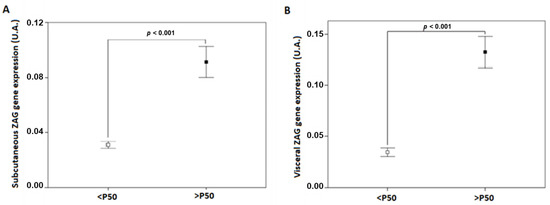 ZAG gene expression levels in SAT (A) and VAT (B) adipose tissue of patients with class III obesity. P50, the 50th percentile of ZAG; SAT, subcutaneous adipose tissue; VAT, visceral adipose tissue; ZAG, zinc-α2 glycoprotein.