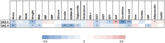 Correlations between clinical and metabolic parameters and adipose tissue ZAG levels. Abbreviations: ALP, alkaline phosphatase; BMI, body mass index; CRP, c reactive protein; DBP, diastolic blood pressure; GGT, gamma-glutamyl transferase; GOT, glutamic oxaloacetic transaminase; GPT, glutamic pyruvic transaminase; HDL-c, high-density lipoprotein cholesterol; HOMA-IR, homeostasis model assessment of insulin resistance; SBP, systolic blood pressure; WHR, waist to hip ratio; ZAG.S; subcutaneous adipose tissue zinc-α2 glycoprotein; ZAG.V; visceral adipose tissue zinc-α2 glycoprotein. Statistical significance is expressed as: * p < 0.05; ** p < 0.01.