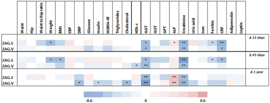 Correlations between clinical and biochemical parameter changes after surgery and basal adipose tissue ZAG levels. Abbreviations: Δ, percentage decrease ((initial value − final value)/initial value)*100; ALP, alkaline phosphatase; BMI, body mass index; CRP, c reactive protein; DBP, diastolic blood pressure; GGT, gamma-glutamyl transferase; GOT, glutamic oxaloacetic transaminase; GPT, glutamic pyruvic transaminase; HDL-c, high-density lipoprotein cholesterol; HOMA-IR, homeostasis model assessment of insulin resistance; SBP, systolic blood pressure; WHR, waist to hip ratio; ZAG.S; subcutaneous adipose tissue ZAG; ZAG.V; visceral adipose tissue ZAG. Statistical significance is expressed as: * p < 0.05; ** p < 0.01.