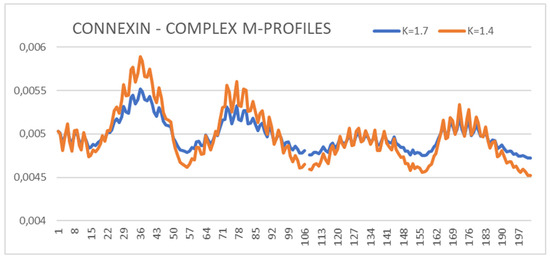 The summary of M distributions for connexin in the presence of Ca2+ (K = 1.7) and in its absence (K = 1.4)—status of chain A in complexes is shown. The numbers on the x-axis represent the order of residues in a chain—the numbers are not the positions as it is given in PDB.