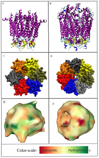 3D structure of: (A)—connexin’s hemi-channel, (B)—pannexin’s channel with secondary structure distinguished: yellow—Beta-sheet, magenta—transmembrane helices, dark blue—external helices, green—random coil. The beta-sheet is in the outer membrane part that is exposed to the outside of the cell. (C,D) represent the differences in channel construction as well as the six and 7-fold symmetry. (E,F)—hydrophobicity visualization: connexin and pannexin respectively. Images (E,F) created by NGL Viewer: Rose et al. (2018) NGL viewer: web-based molecular graphics for large complexes. Bioinformatics doi:10.1093/bioinformatics/bty419, and RCSB PDB. (A,B)—orientation of the molecules: Top—intra-cellular area, bottom—extra-cellular area; (C,D)—orientation from the point of view of the intra-cellular area—symmetry axis perpendicular to the plane of the figure; (E,F)—side view arbitrarily selected to visualize the shape differences of the compared complexes.