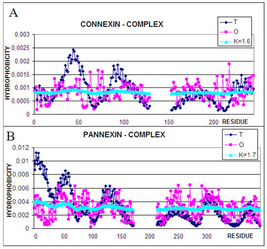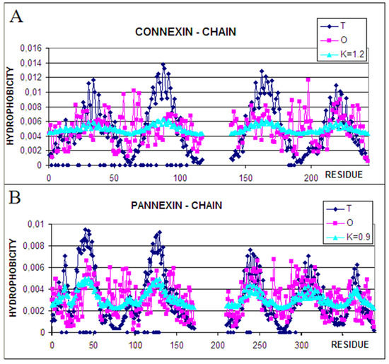 The role of the N-terminal half seems to be similar as responsible for channel construction– high hydrophobicity deficiency in connexin as well as in pannexin. The expected high level in the central part (high T values) of the complex is not met by real impacts revealing a clear hydrophobicity deficit. The C-terminal half of the chains represents the status of relatively high accordance between T and O, which suggests the role of stabilization in this area; however, the higher-than-expected hydrophobicity suggests the interaction with the membrane environment.