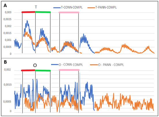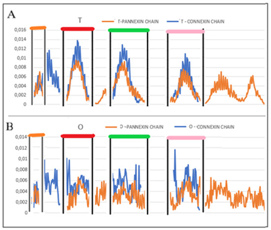 Comparison of hydrophobicity profiles: (A)—profile T, (B)—profile O analogical in pannexin (red) and connexin (blue) as observed in the complex and sections identified as analogous in T profiles of complexes. Similar fragments are distinguished by colors according to the presentation in Figure 8 and Table 2.