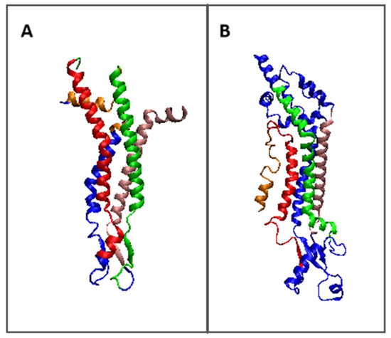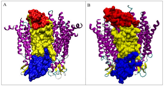 3D presentation: (A)—pannexin; (B)—connexin with highlighted parts: the part facing the cytoplasm—red, the part anchored in the membrane—yellow, the part facing the outside of the cell—blue marine. Violet chains—adjacent chains to visualize the mutual orientation of adjacent chains. This status is given in Table 3.