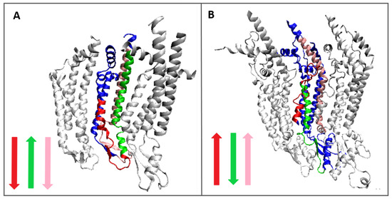 3D presentation showing the analogous fragments in the complex—(A)—connexin, (B)—pannexin. Colors identification is given in Table 2. Notice the opposite orientation of the selected fragments shown by color arrows. Chain (A)—dark blue. The two white chains in each structure visualize the surrounding of the discussed chain. Molecule orientation:—Top—intra-cellular; Bottom—extracellular direction. Colors as given in Table 2 and Figure 7.