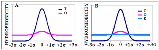 From the point of view of the FOD-M model, the M distribution of linear form parallel to the X-axis may symbolize the independence of the water environment. The similarity of M distribution to R distribution represents the status deprived of any specific hydrophobicity distribution except the unified one. The general analysis of this observation is necessary for further analysis.
