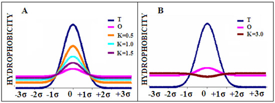 Since the object of analysis in this paper is the identification of differences with respect to the role of the hydrophobic environment, the analysis carried out on the basis of the fuzzy oil drop model (FOD) [49] and its modified version FOD-M [42,43,44] provides an assessment of the degree of adjustment of the hydrophobicity distribution in relation to the idealized one, which is the distribution consistent with the 3D Gauss function. For obvious reasons, the FOD-M model was used to describe the protein structures discussed here. The values of the parameter K measuring the participation of the factors different from the polar water were determined. In this particular case, it is the presence and influence of the hydrophobic environment of the membrane.