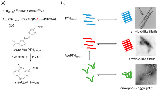 In the past decades, the photoinduced switching of protein functionalities has emerged as an important concept to modulate protein function, often by modulations in binding specificity between proteins and ligands. Thus, not only enzymes have been equipped with photosensitive switches, but also larger protein complexes, involved in many physiological or neurological functions [28]. To this end, artificial photoswitches are embedded into either the main chain or side chains of polypeptides, in order to change their secondary structures by photoinduced conformational changes of the photoswitches. Thereby, a plethora of different photoswitches, such as those based on cis-trans-isomerization of azo-dyes [29,30] stilbenes [31] and hemithioindigos [32,33], have been developed. Important for the proper use of a specific photoswitch inside a polypeptide chain is not only the quest to retain the initial (functional) secondary structure of the protein, but also to achieve a reasonably stable conformation after photoswitching, so as to allow for sufficient time to exert the desired effect. Many examples of such sufficiently stable and also reversible photoswitches have been reported, allowing one to modulate several expects of protein function [34,35,36,37,38,39]. Here, we report on an approach to modulate the fibrillization of PTH, equipped with a photoswitch at a specific position in the peptide sequence, in order to reversibly trigger its aggregation/disaggregation (see Figure 1).