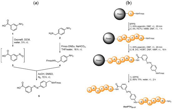 (a) Synthesis of Fmoc-protected trans-3,4′-AMPB 5. (b) Solid-phase peptide synthesis strategy towards the peptide AzoPTH25–37.