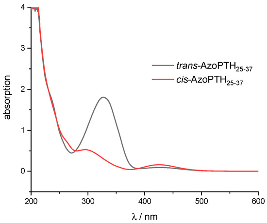 UV/Vis absorption spectra for trans-AzoPTH25–37 after synthesis and for the cis-enriched photo-stationary state after irradiation at 340 nm, which almost corresponds to cis-AzoPTH25–37.