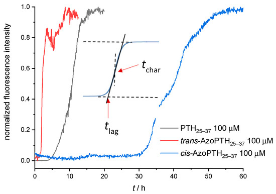 In a first attempt, the fibrillization kinetics for pure trans-AzoPTH25–37, cis-AzoPTH25–37, and the PTH-derived peptide PTH25–37 were measured at 37 °C and the results are shown in Figure 4. Two characteristic times were used to characterize the fibrillization (Figure 4, Table 1): the lag time tlag corresponds to the time before an increase in the fluorescence signal occurs; the characteristic time tchar indicates at which time 50% of the maximum fluorescence was reached.