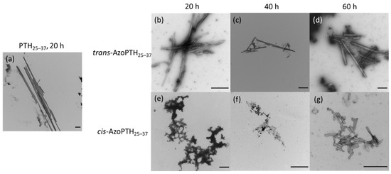 TEM recordings of fibrils obtained from PTH25–37, cis-AzoPTH25–37, and trans-AzoPTH25–37 at (T = 37 °C, buffer = 50 mM Na2HPO4, pH = 7.4) after different time points (all scale bars corresponds to 500 nm). (a). PTH25–37 after 20 h, (b) trans-AzoPTH25–37 after 20 h (100 μM), (c) trans-AzoPTH25–37 after 40 h (100 μM), (d) trans-AzoPTH25–37 after 60 h (100 μM), (e) cis-AzoPTH25–37 after 20 h (100 μM), (f) cis-AzoPTH25–37 after 40 h (100 μM), and (g) cis-AzoPTH25–37 after 60 h (100 μM).