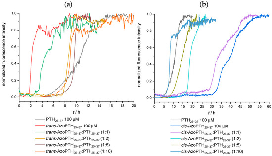 In further experiments, we investigated the (catalytic) influence of the AzoPTH25–37 isomers on the fibrillization of PTH25–37 (Figure 6). We previously observed such catalytic effects of β-turn modified amyloids (Aβ) on the fibrillization of the Alzheimer peptide Aβ1–40 [49]. Thus 100 μM of PTH25–37 were fibrillized in the presence of various concentrations of the respective AzoPTH25–37 isomer (10/20/50/100 μM). Kinetic measurements revealed that the fibrillization behavior of PTH25–37 was affected in the same way as the pure AzoPTH25–37 isomers.